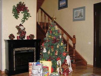 Today, Tanya took down all the Christmas decorations. Kuchma was busy casing the attic while Tanya stows everything. She put them up while I was in Canada so they have been up for over a month. Last night she went around taking pictures of the decorations and of all of us in various states of recovery from supper. That is what I get for putting fresh batteries in her camera.