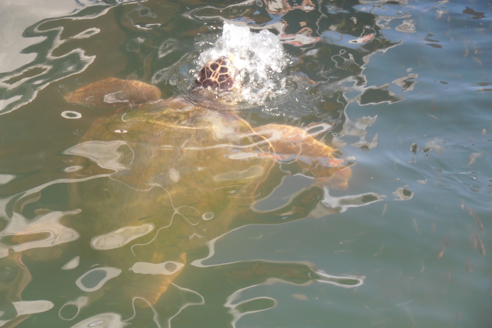 As we approached the beach, we saw a crowd of boats around one boat which had raised a sea turtle with a bait on a line. We got close enough to see it. It was still at this boat when we left 1 1/2 hours later which made me wonder. Either the turtle was dumb as spit or it had the gig down cold and would perform for treats or, and I hoped this was NOT the case, it was somehow anchored to the spot.