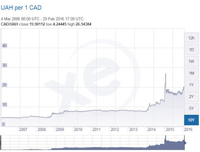 When I first came to Ukraine in 1997, the exchange rate was about 5 Hrivna to 1 dollar. It stayed that way until the bottom fell out of the global washtub in 2008 and then went to 8 Hrivna to the dollar. That held until the Time of Troubles and Russia's invasion of Ukraine in 2014 and oil prices took a tumble about the same time. The Canadian dollar held in and around the mid teens in Hrivna and the US Dollar in the low-mid-twenties. The CAD has strengthened against the USD recently and now trades at about 20 Hrivna to the CAD.